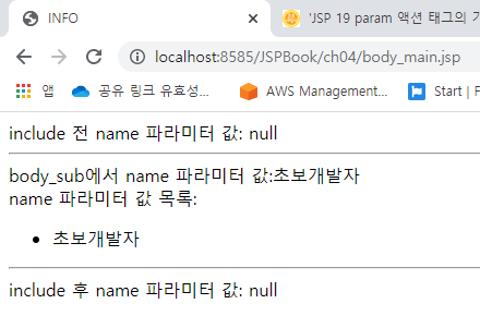 예제 7.8~9) <jsp:param> 실행 전/후 파라미터 값 변화 발생 여부 확인하기