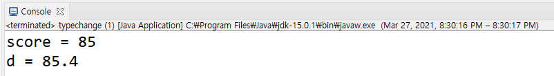 즉, int score = (int) d ; → int score = (int) 85. 4; → int score = 85; 과정으로 진행되었다.