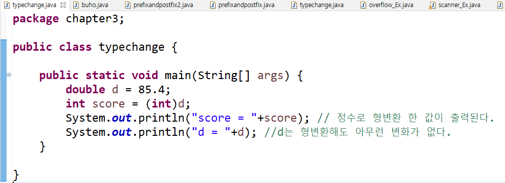 int score = (int) d ; // double 타입 변수 d가 int 타입으로 형변환되었다.