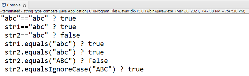 System.out.println(str1.equals(str2)) ; // true를 출력한다.