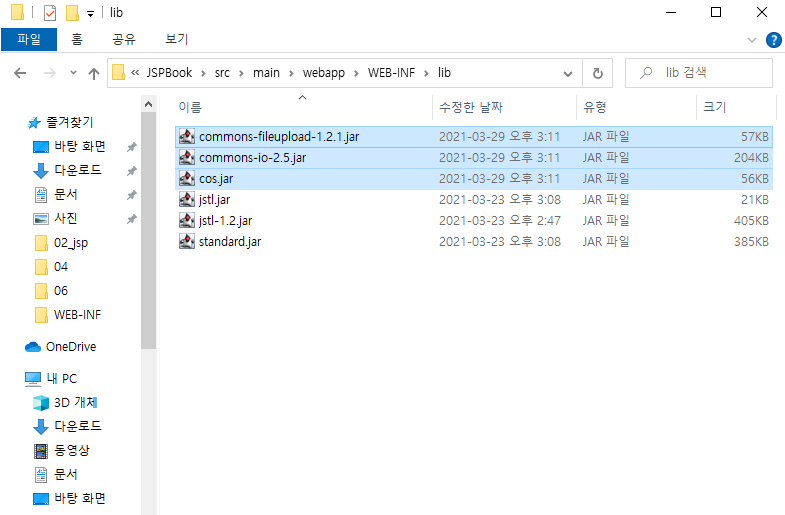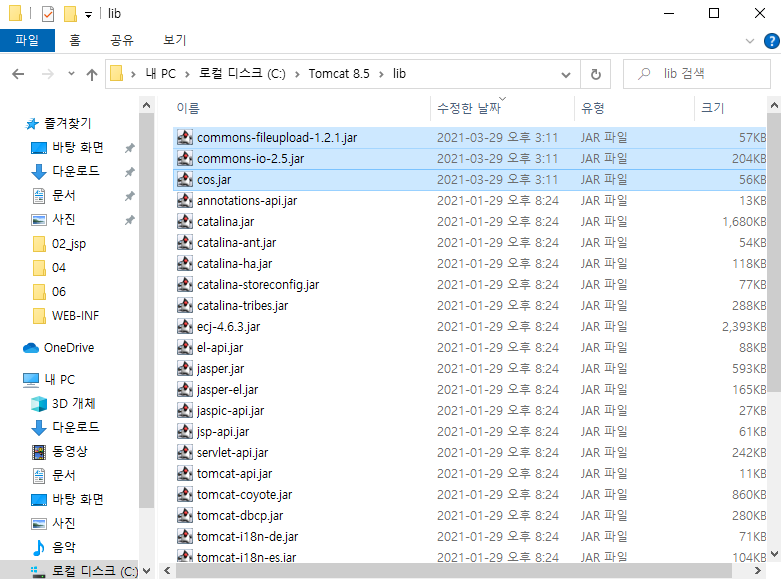 JSP에서 추가적으로 라이브러리를 사용하려면, Tomcat 8.5 폴더에 lib(라이브러리) 폴더에 위 폴더를 다운받아서 붙여넣는다.
