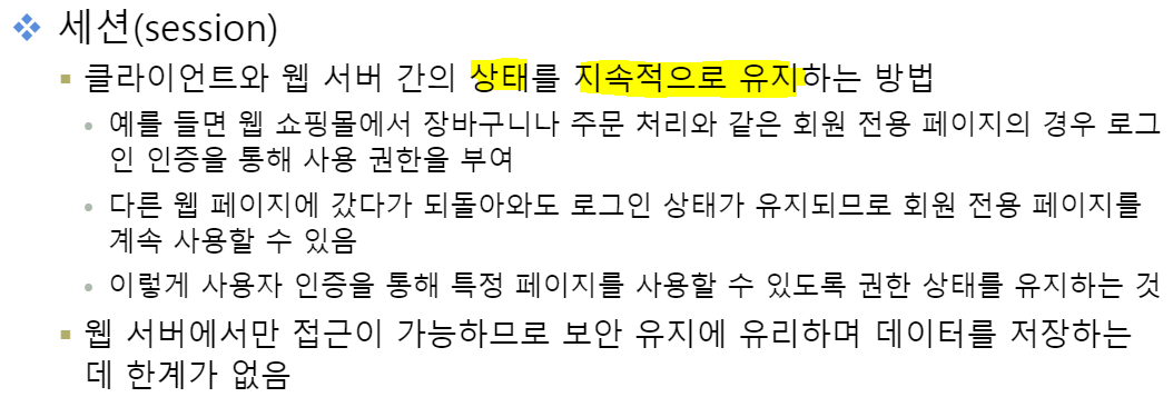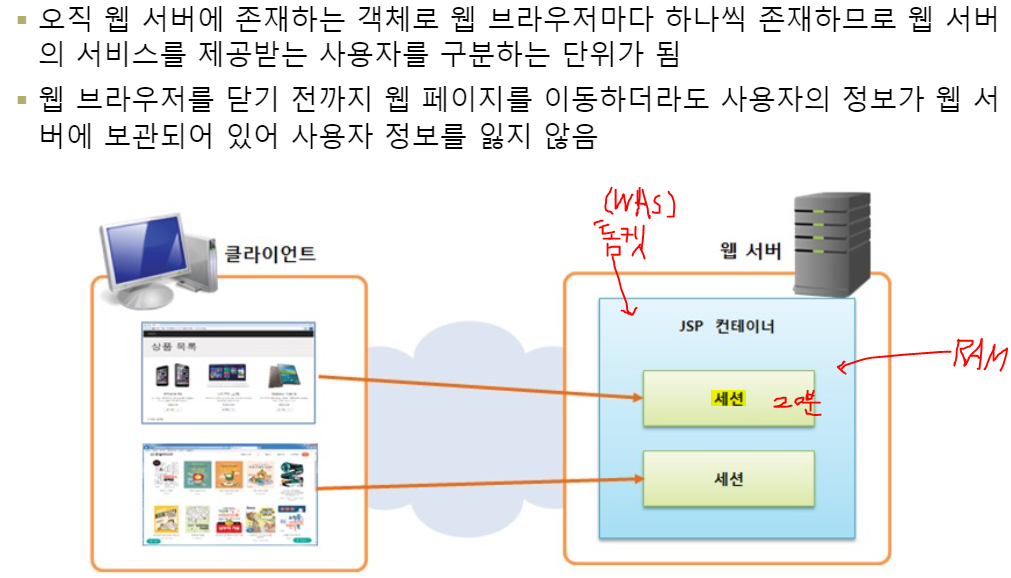 클라이언트정보를 서버 메모리에 로드시키는게 세션이다.