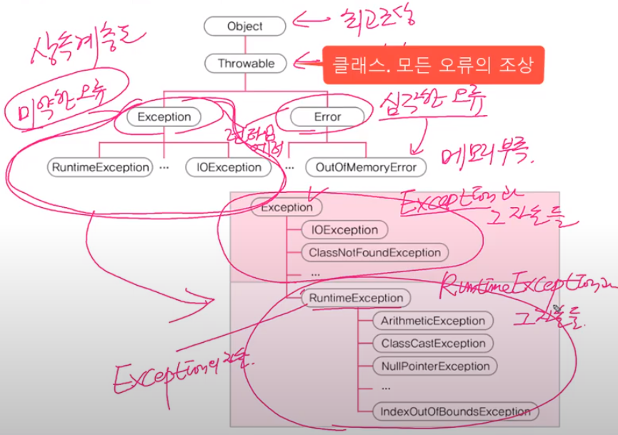 런타임 에러 : Exception (미약한 오류) + Error (심각한 오류)