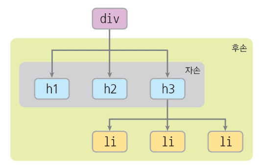 <h숫자>태그는 div의 자손, <li>는 div의 후손