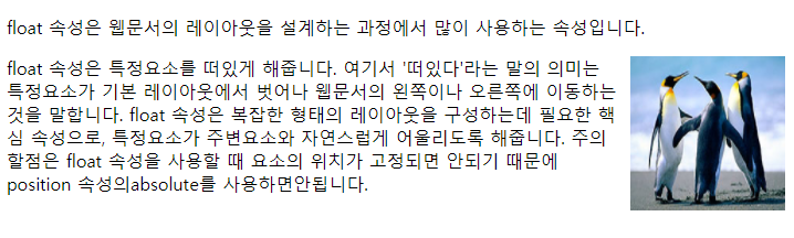 <p>float 속성은 웹문서의 레이아웃을 설계하는 과정에서 많이 사용하는 속성입니다.</p>