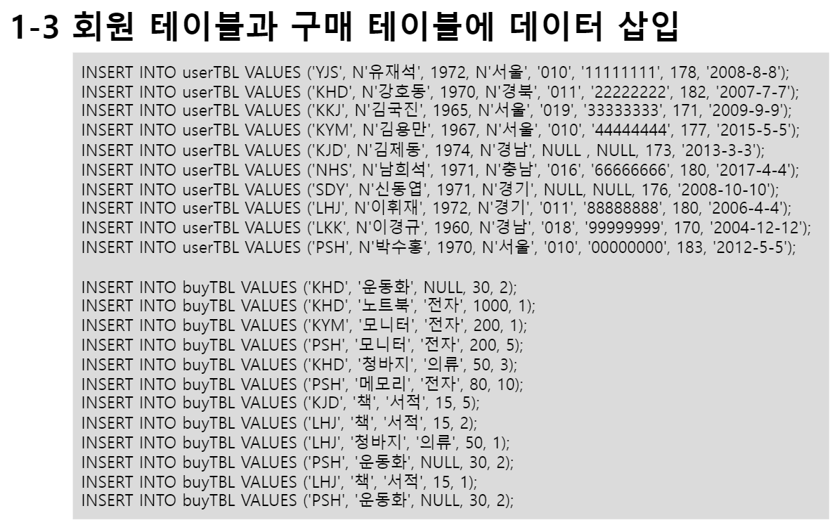 회원 테이블과 구매 테이블에 데이터 삽입