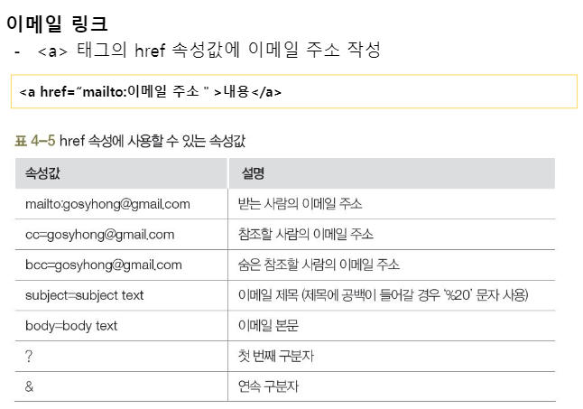 <a href="mailto:gosyhong@gmail.com?cc=haejini.chung@gmail.com&bcc=gooheekoo@gmail.com&subject=질문있어요&body=웹프로그래밍">받는사람, 참조, 숨은참조, 제목, 본문</a><br>