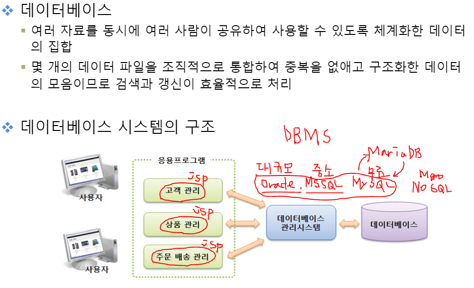 관계형 데이터베이스 : DB안의 테이블들이 서로 모델링되어 관계로 되어있다.