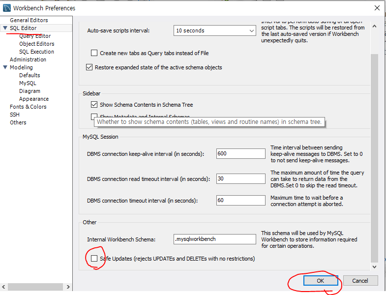 edit 에 preferences , sql editor 탭