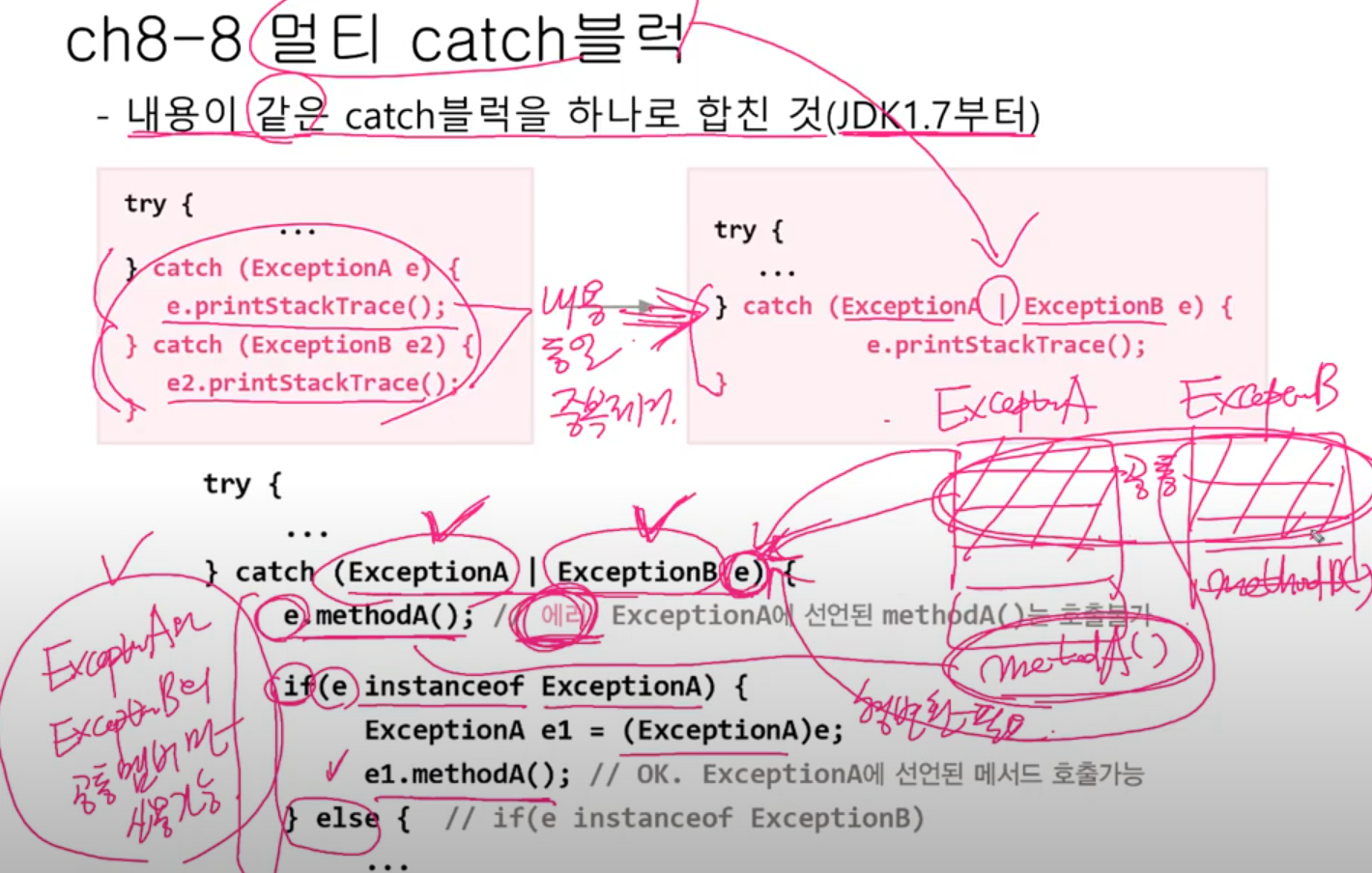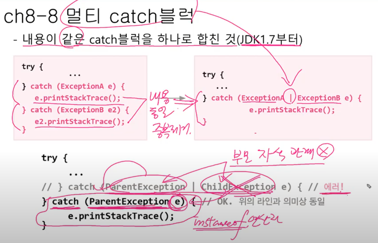 ' | ' 기호를 이용해서 , 하나의 catch 블럭으로 합칠 수 있는데, 이를 멀티 catch 블럭이라 한다.